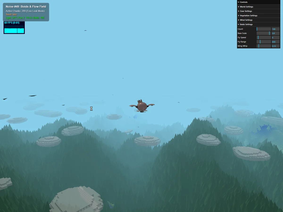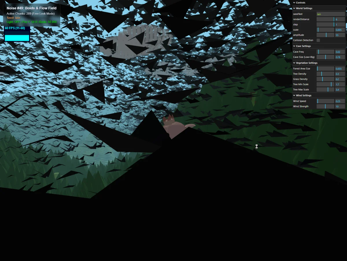 lain-lab.com今回は、今朝の理論編 [[Noise 入門 #49] Boids × Flow Field] )に基づき、この風のベクトル場に「自律的に動く鳥の群れ(Boids)」を放ちます。
