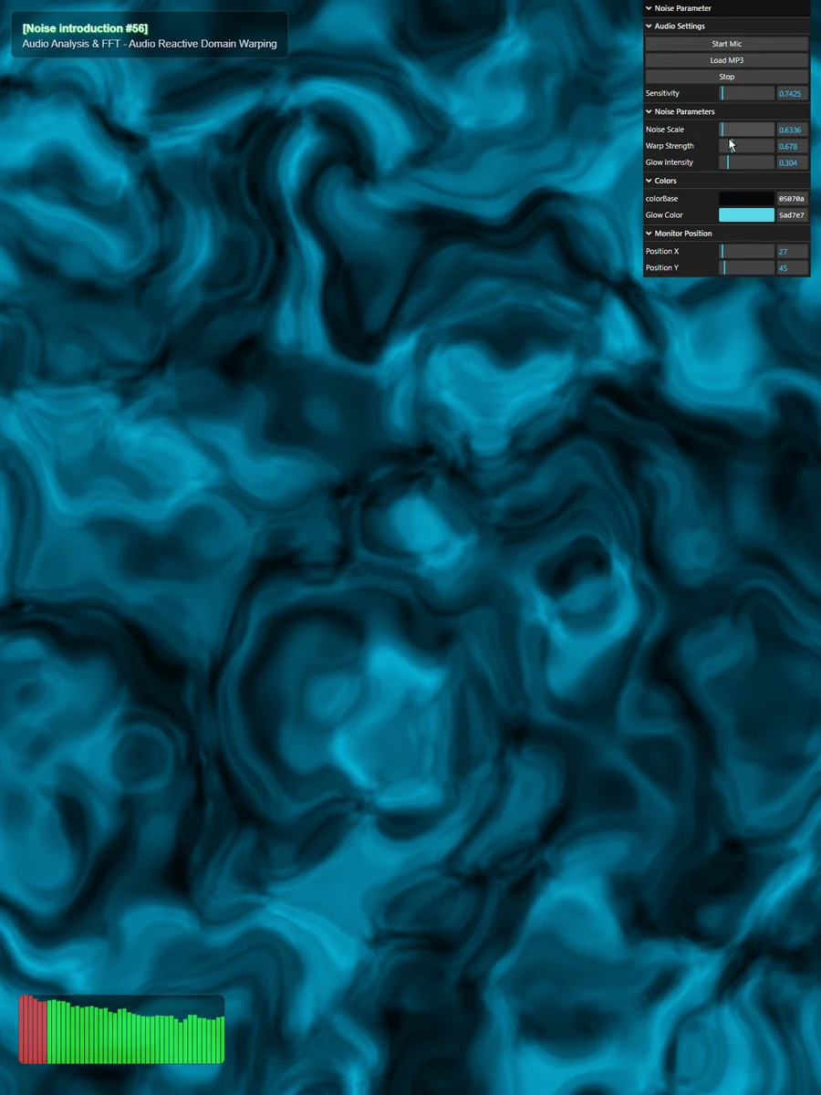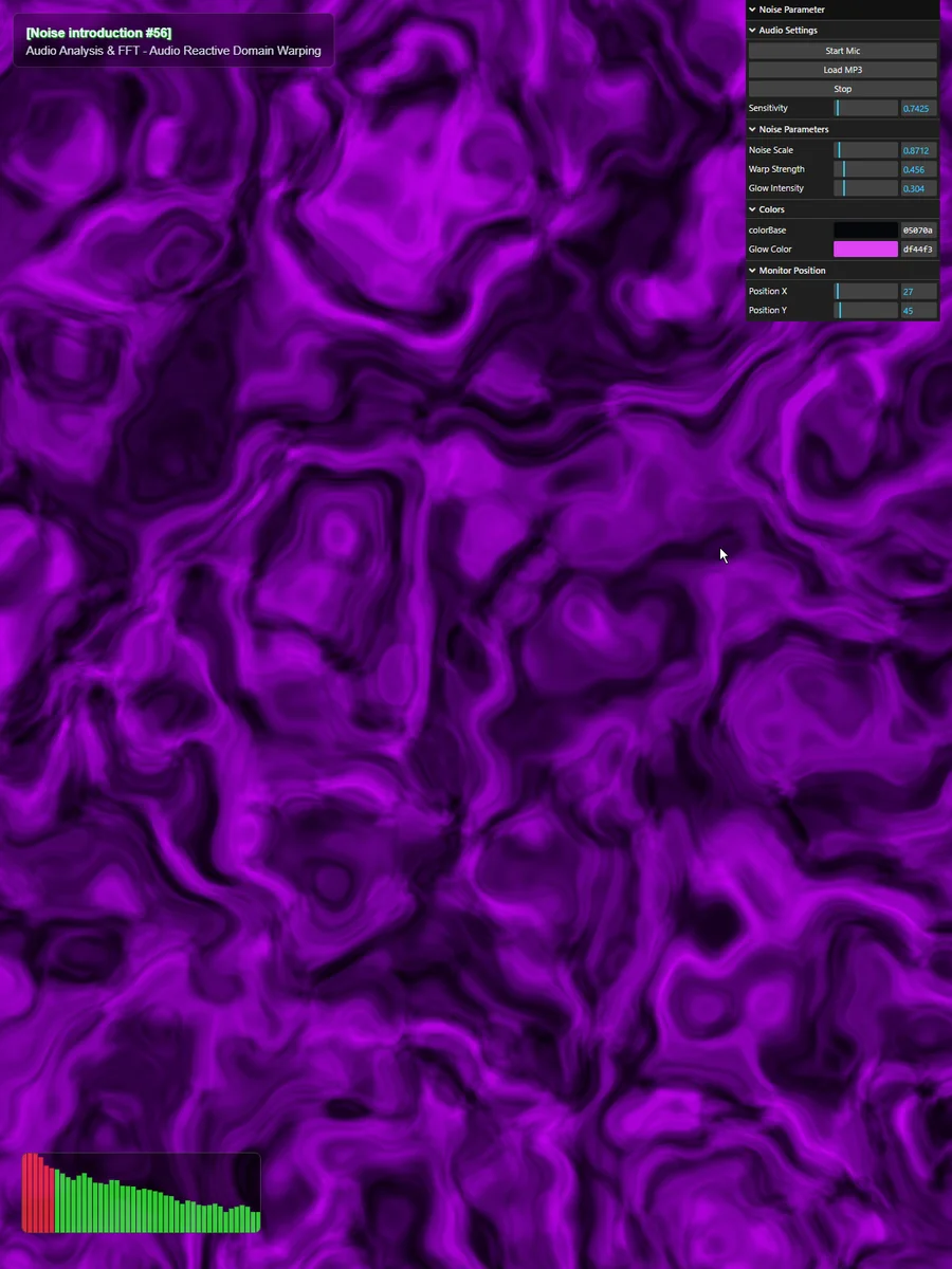 これが「音」と「Shader」を繋ぐ最も基礎的なパイプラインです。 データを抽出して uniform に流し込む。たったこれだけのことですが、この u_audio という変数はノイズのあらゆるパラメータ(スケール、速度、歪みの強さ、色の明るさ)に掛け合わせることができます。