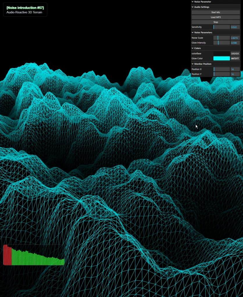 当初は2D平面上のドメインワーピングを解説する予定でしたが、実装の過程で「音のエネルギー」をよりダイナミックに視覚化するため、3D地形(Vertex Displacement)へと昇華させました。数式による「空間のねじれ」が、音楽という命を吹き込まれることで、激しく隆起するデジタル山脈へと姿を変えています。