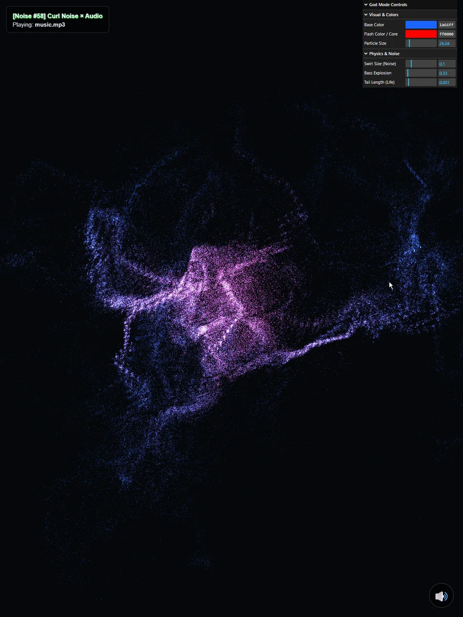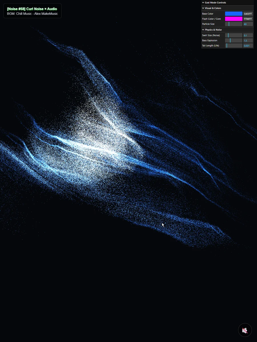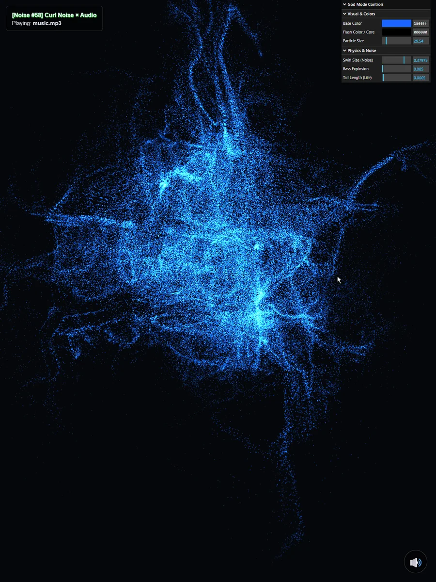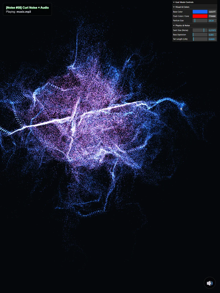この Curl Noise の引数(空間の歪み具合)や、算出されたベクトル(移動の速さ)に対して、Web Audio APIのFFT(高速フーリエ変換)解析から抽出した「周波数ごとの音の強さ(0.0〜1.0)」を直接掛け合わせます。音波という物理現象で、流体力学のシミュレーションをリアルタイムにハックするのです。
