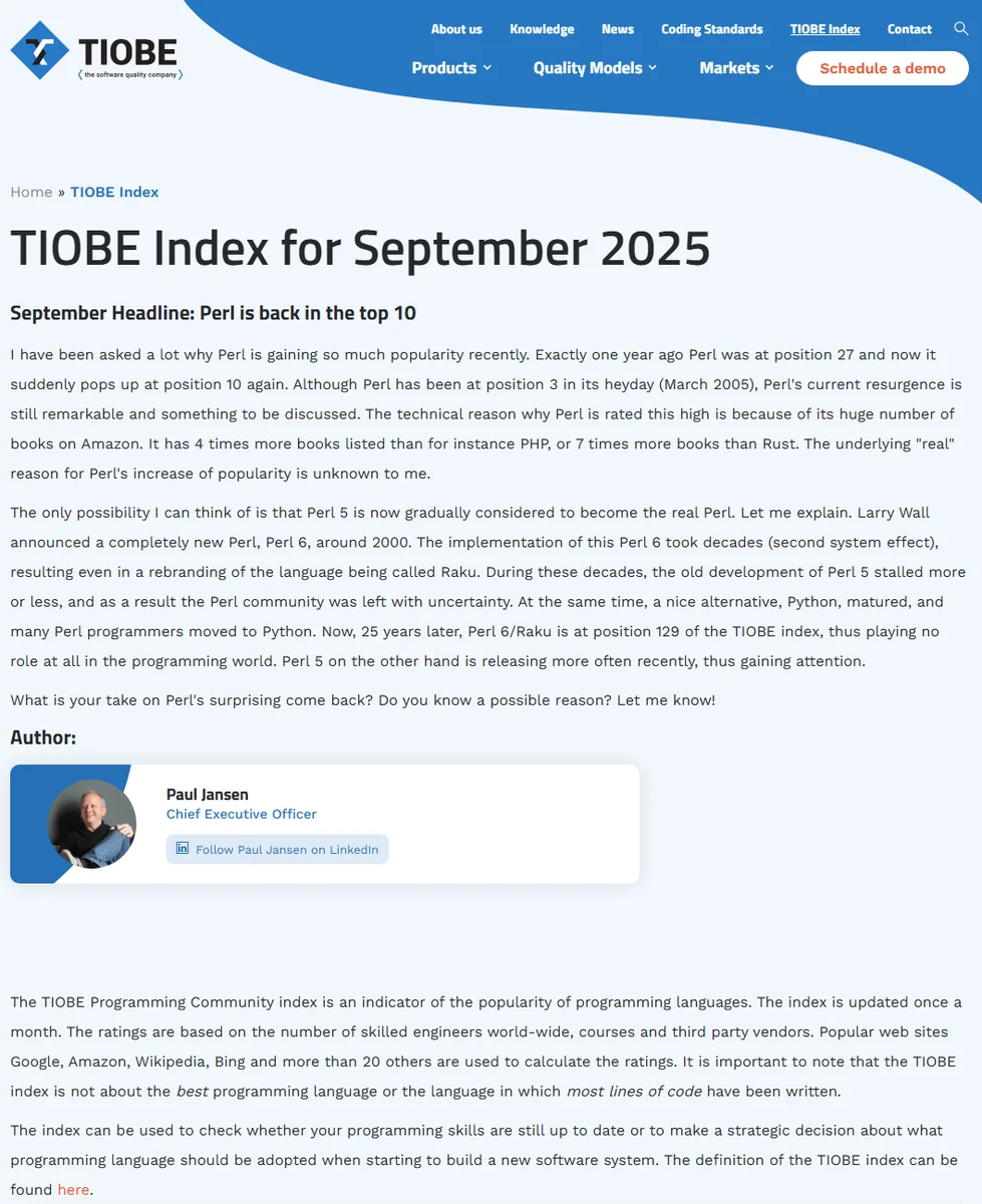 2025年9月、TIOBE Index において Perl が 27位から10位へ急浮上するというニュースは、多くの開発者に驚きを与えた。
