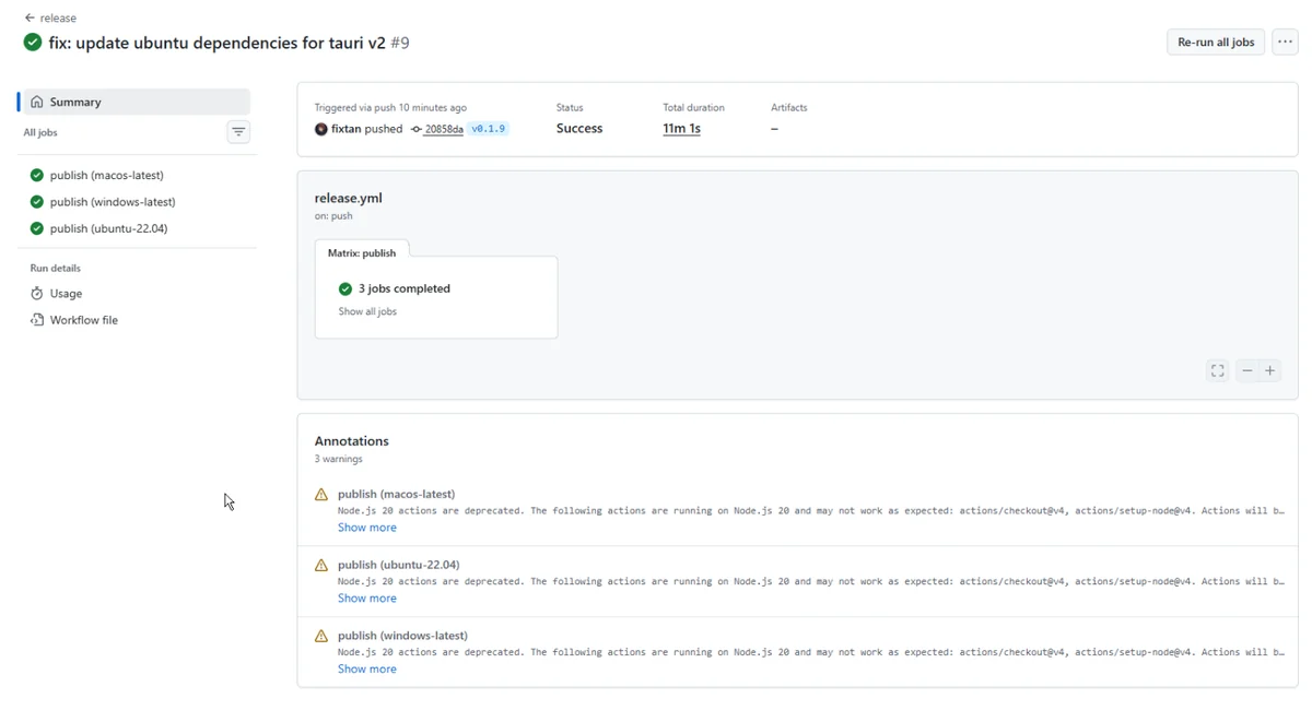 すべてが「Success(緑色のチェック)」になれば成功です。リポジトリの「Releases」ページに、各OS向けのインストーラー(.dmg, .msi, .deb など)が自動生成されています。