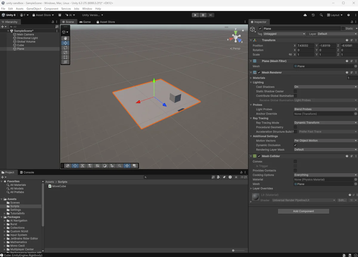 この段階で Play を押すと、 Cube が そのまま下に落ちて視界から消えることがある。