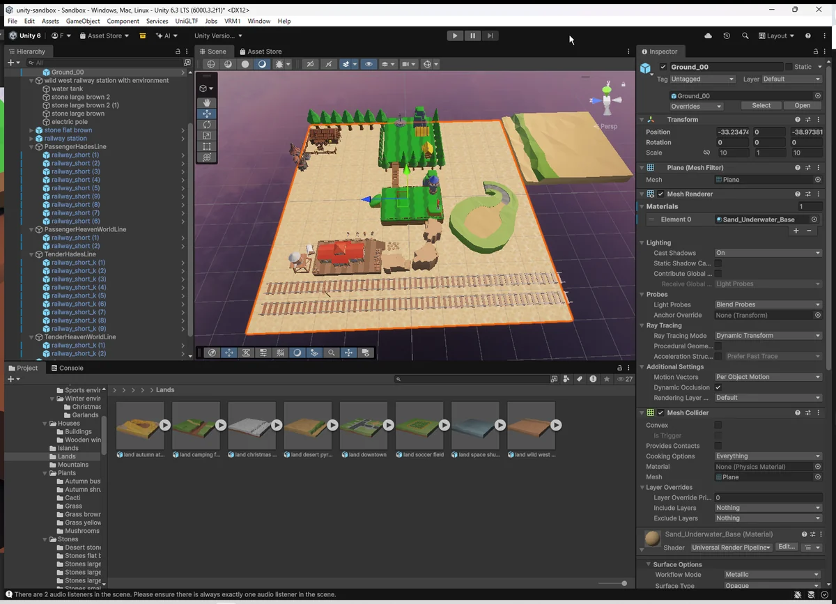 レール敷設と並行して、地形(Ground)と街(Town)のフォルダ構造を整理し始めた。 ここは Three.js とはまったく違う考え方が必要で、Unityらしい “Scene階層で世界を管理する” 感覚が少しずつ身についてきた。