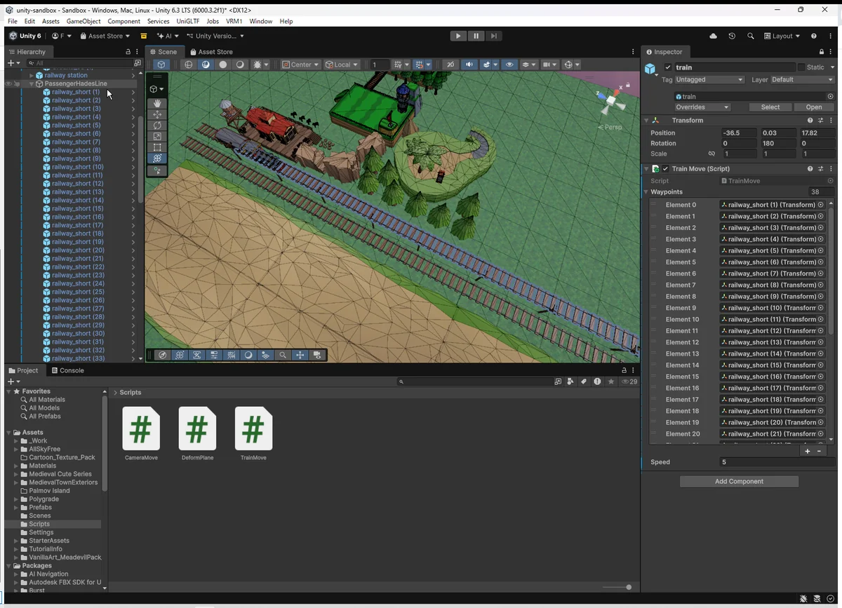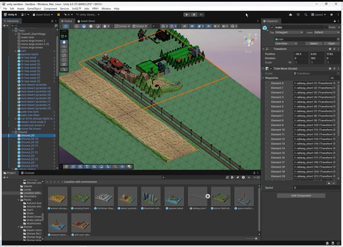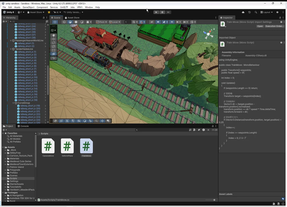 レールだけでなく、列車、駅、地形など 複数オブジェクトを階層ごと整理する場面では必須のテクニックで、 Unityの “エディタが持つ強さ” を理解した瞬間だった。