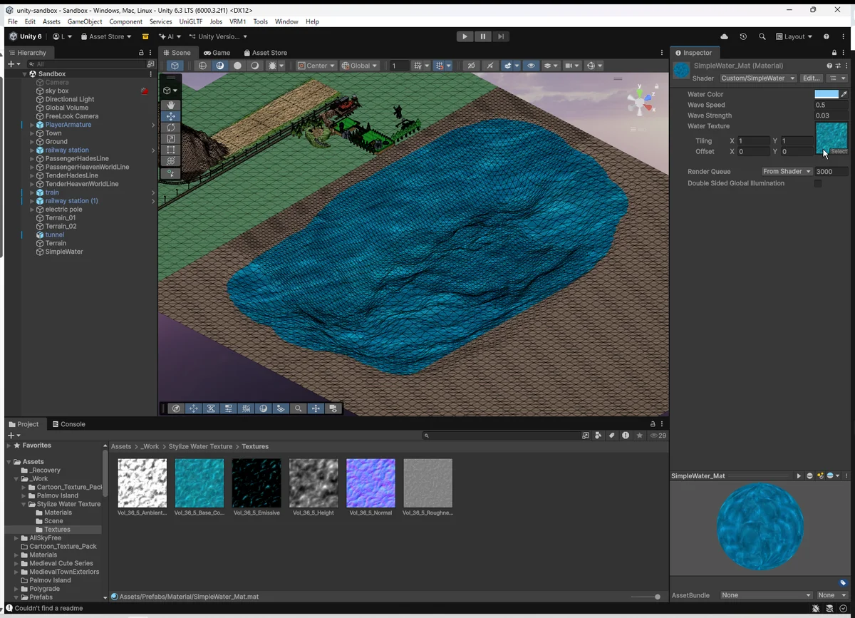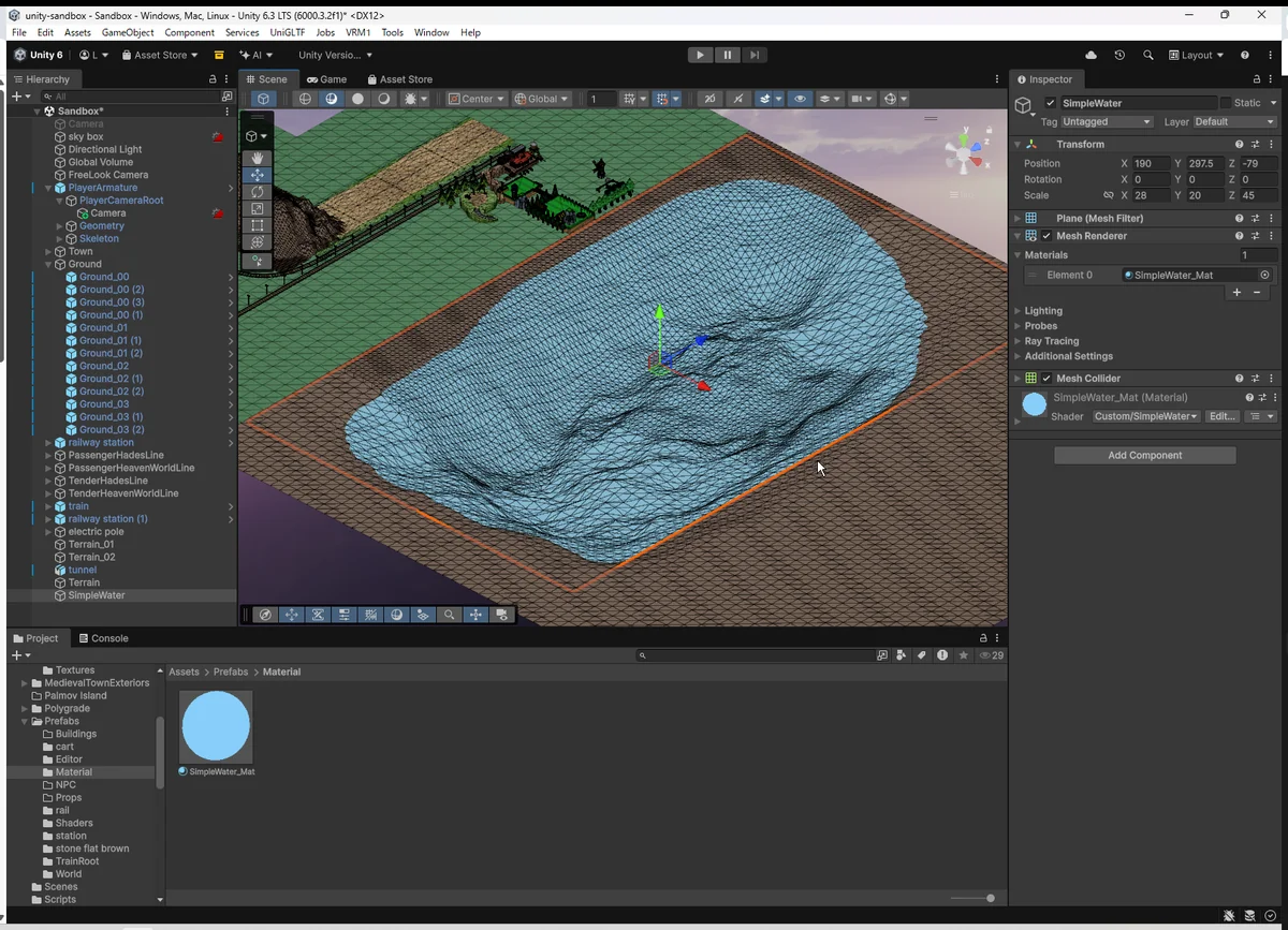 実装内容としては、前回の記事でEditorツールを作成し「Terrain」を一括で底上げしたことによってくぼみを作れるようになったので、 地形を凹ませて、その上にPlaneジオメトリーを配置し、シェーダー処理で地形を上下させて波を演出というもの。