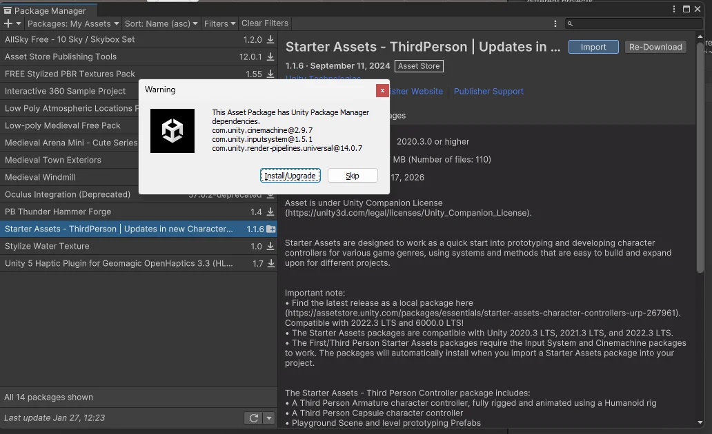 - Package Manager から Starter Assets – Third Person Controller を追加。