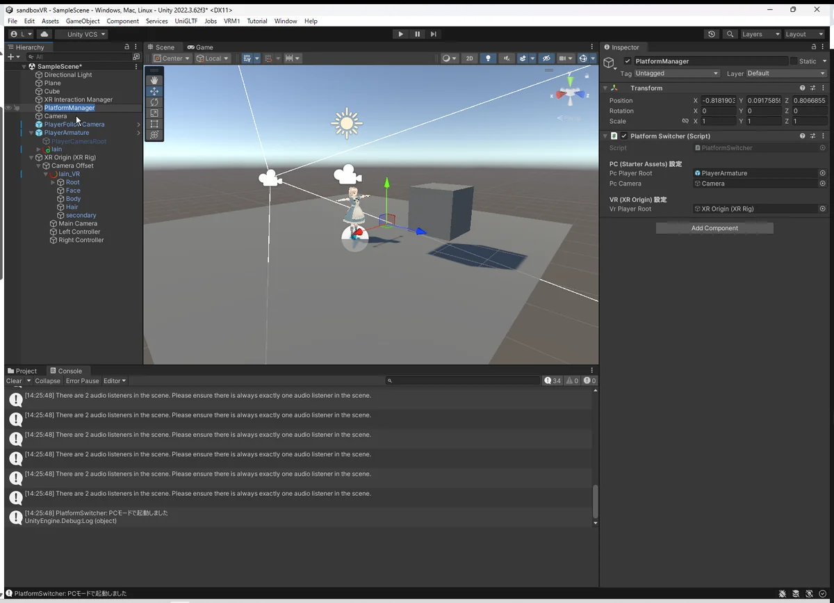PC 側と VR 側の両方に AudioListener がある場合、警告が大量に出る → 片方だけ有効にする。