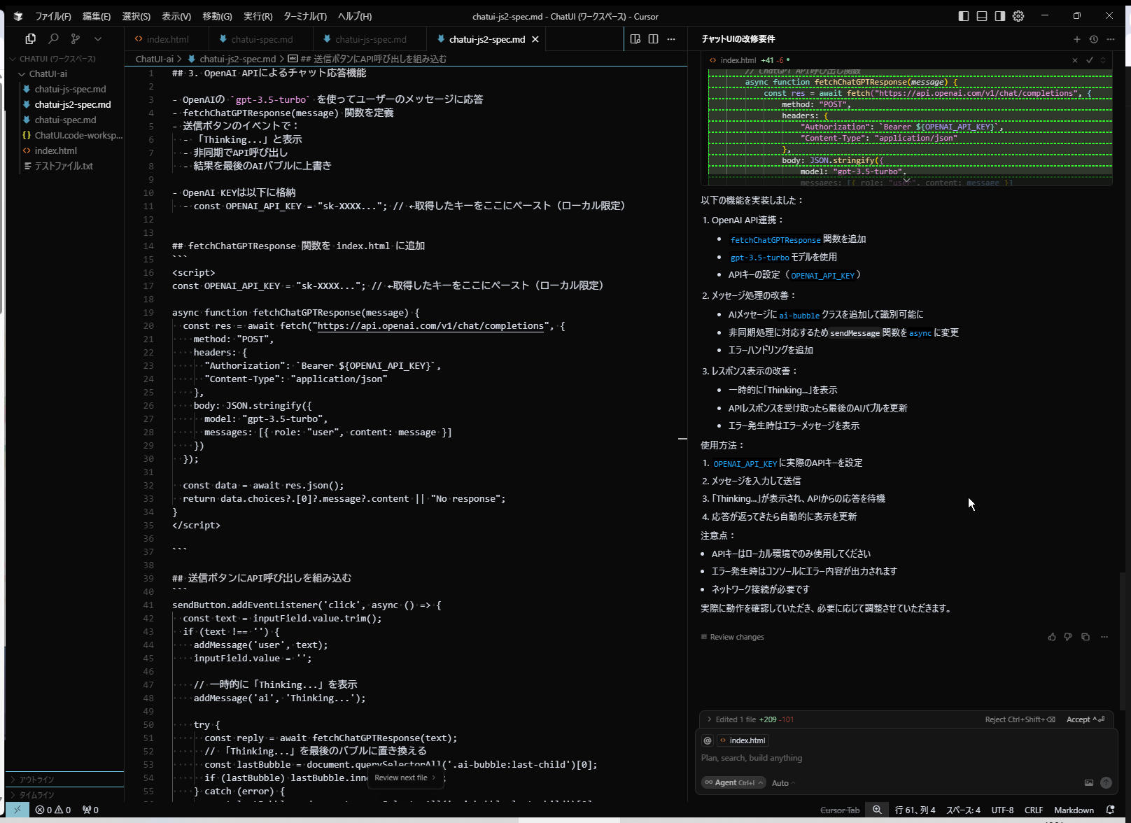 Cursorで作成したindex.htmlファイルは、ローカル環境で動かす前提で進めますが、もし同じようにGithubを利用の元で進めていく場合、APIキーを保存するファイルを公開しないようにしてください。