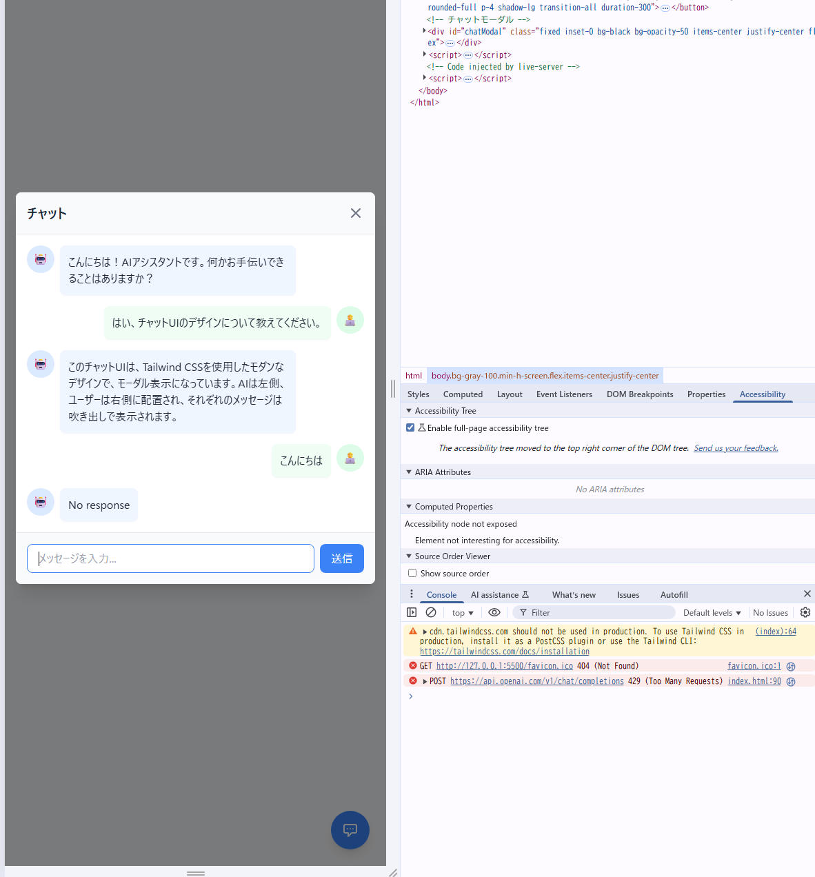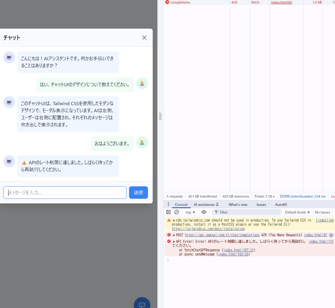 developertoolのエラーメッセージをCursorへ貼り付けて見ましたが、OpenAI側でアクセスをはじかれてる以上、修正する事は困難で、エラーメッセージを日本語化して修正されたのみでした。