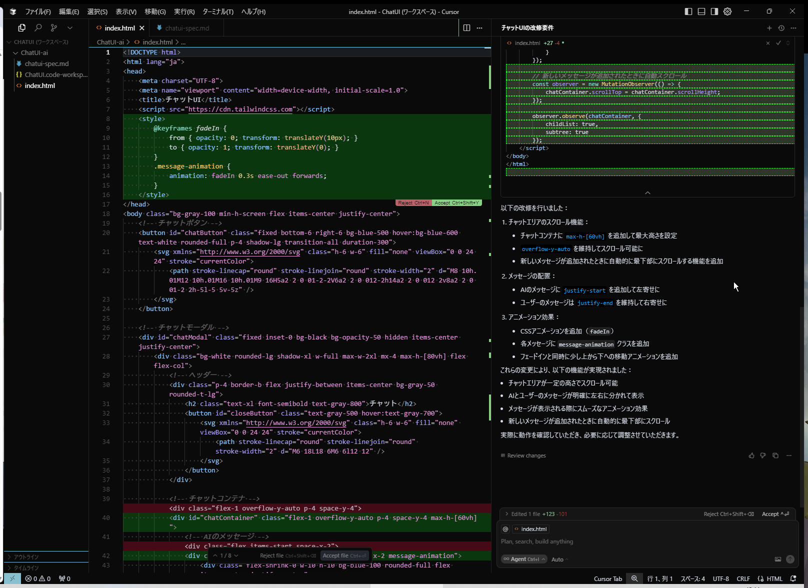 - 修正箇所が明確:Cursorは具体的なUI修正に強いです。上記のように意図を簡潔に伝えることで、DOM構造やTailwindのクラスを自動調整してくれます。