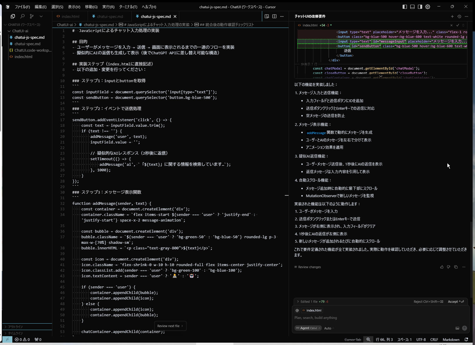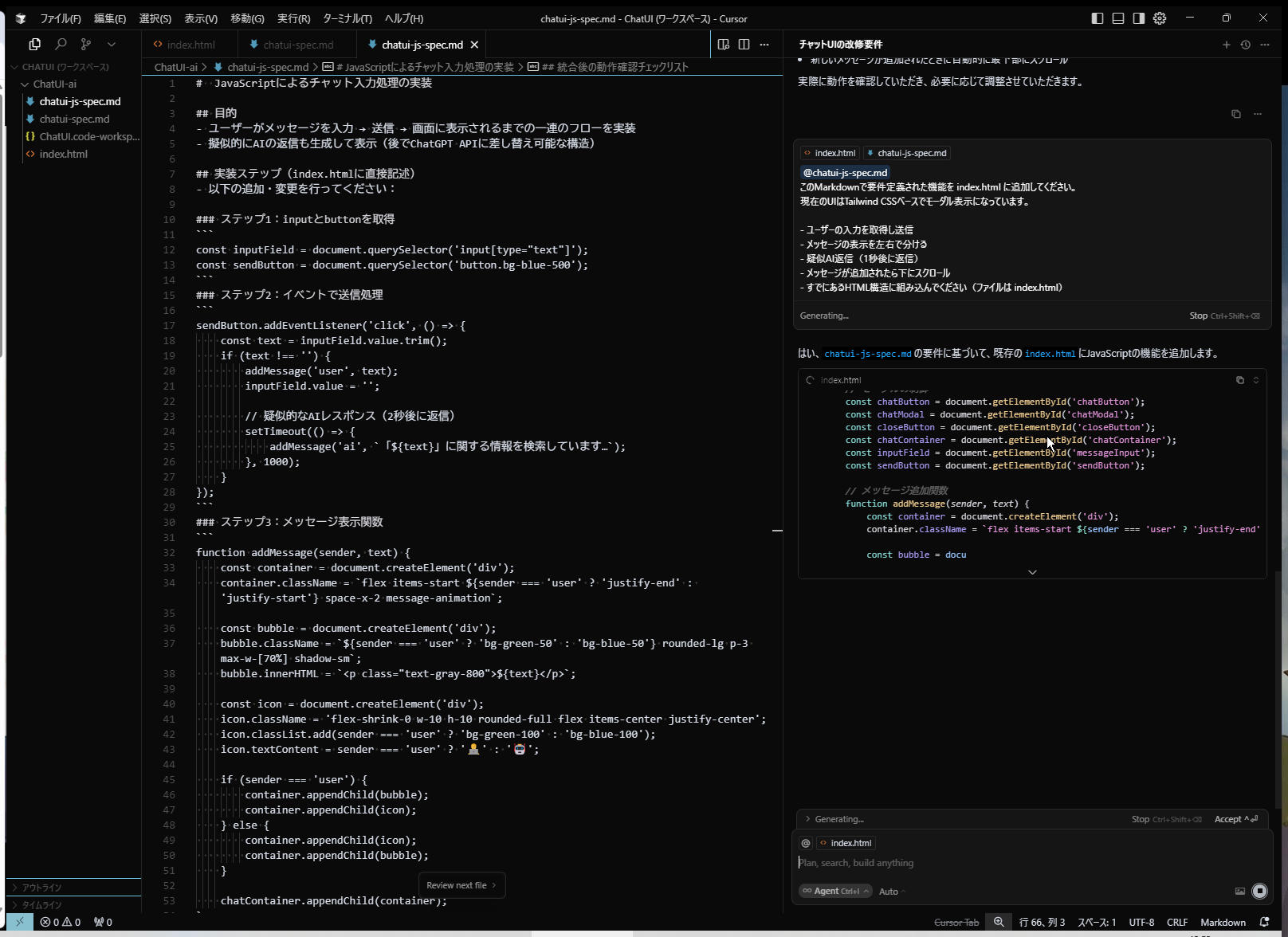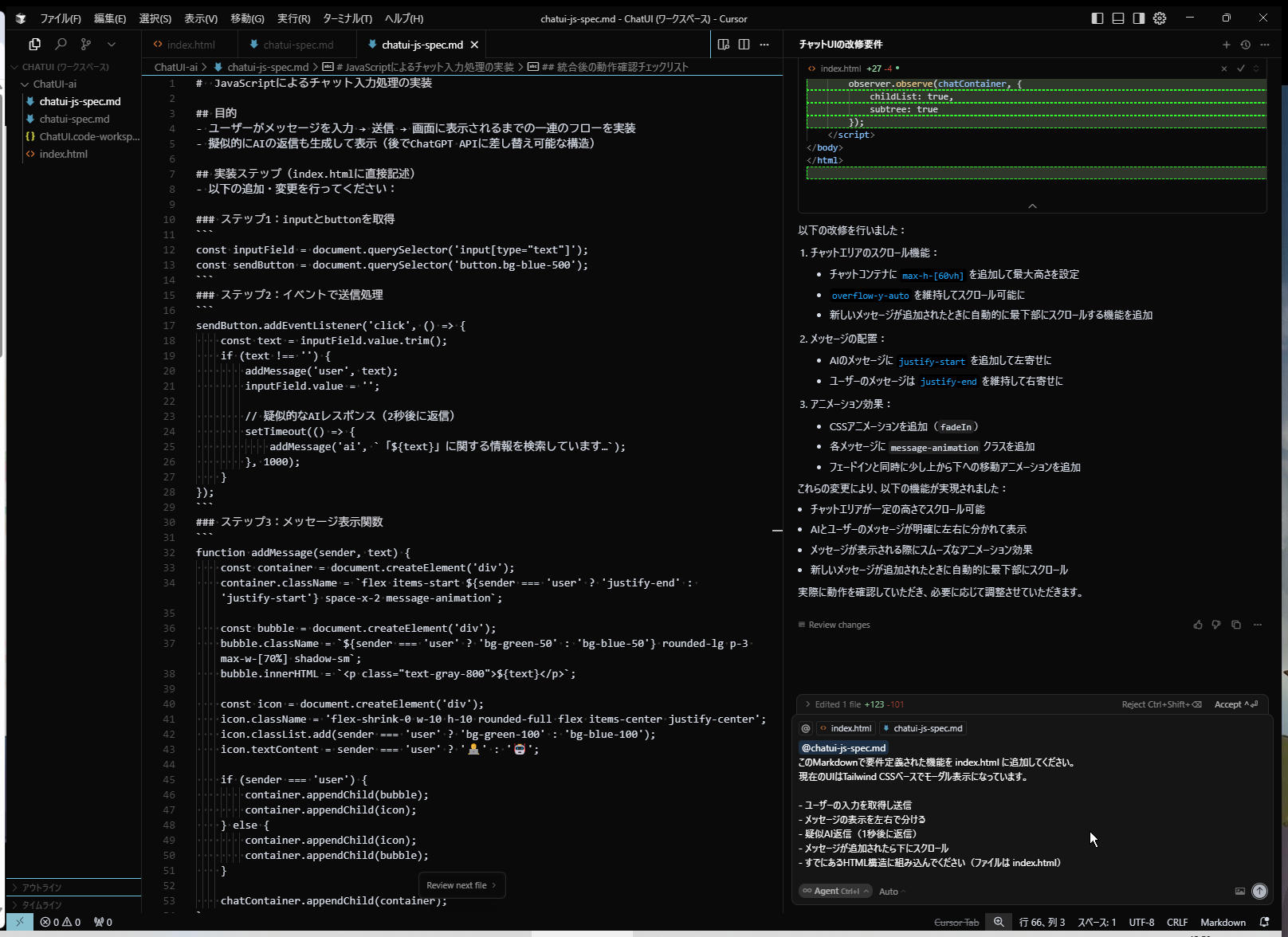 新たに chatui-js2-spec.md を作成し、要件定義を作成して送信。