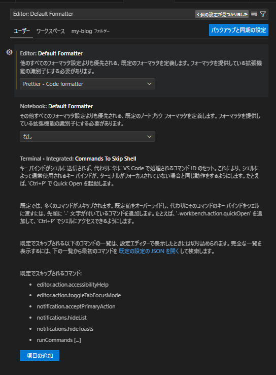 - 「Editor: Default Formatter」を「Prettier - Code formatter」に設定。