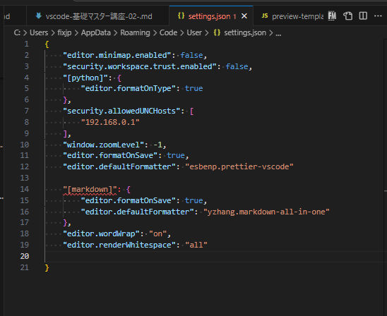 | ”editor.tabSize”: 2 | タブ幅を2スペースに | Markdown・HTML等の見た目がすっきり |