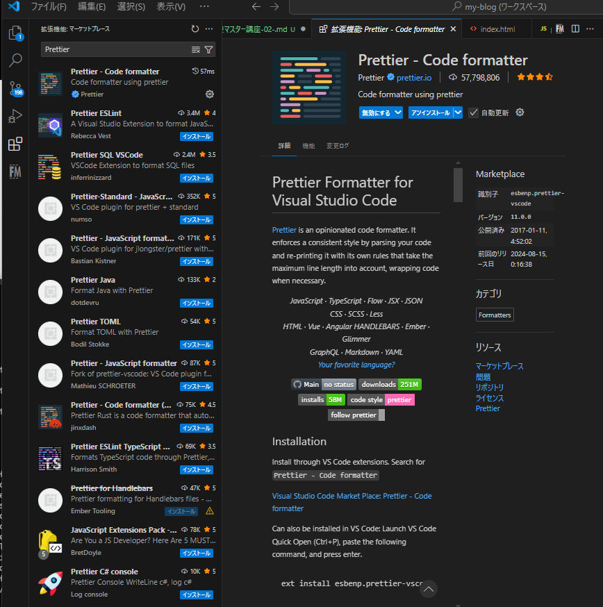 Prettier は、コードのフォーマットを自動で整えてくれる拡張機能です。特に、Markdown や HTML、CSS などの整形に役立ちます。