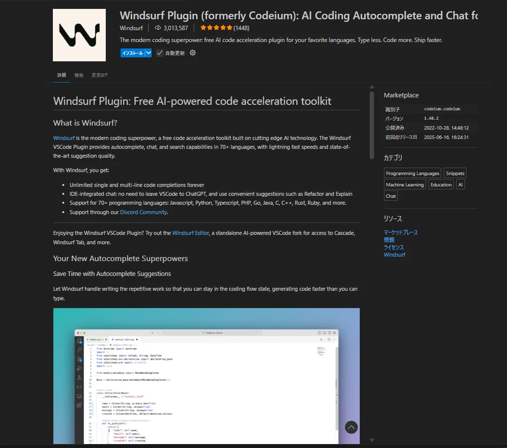 Windsurf (Codeium) は、Visual Studio CodeのMarketplaceから簡単にインストールできます。