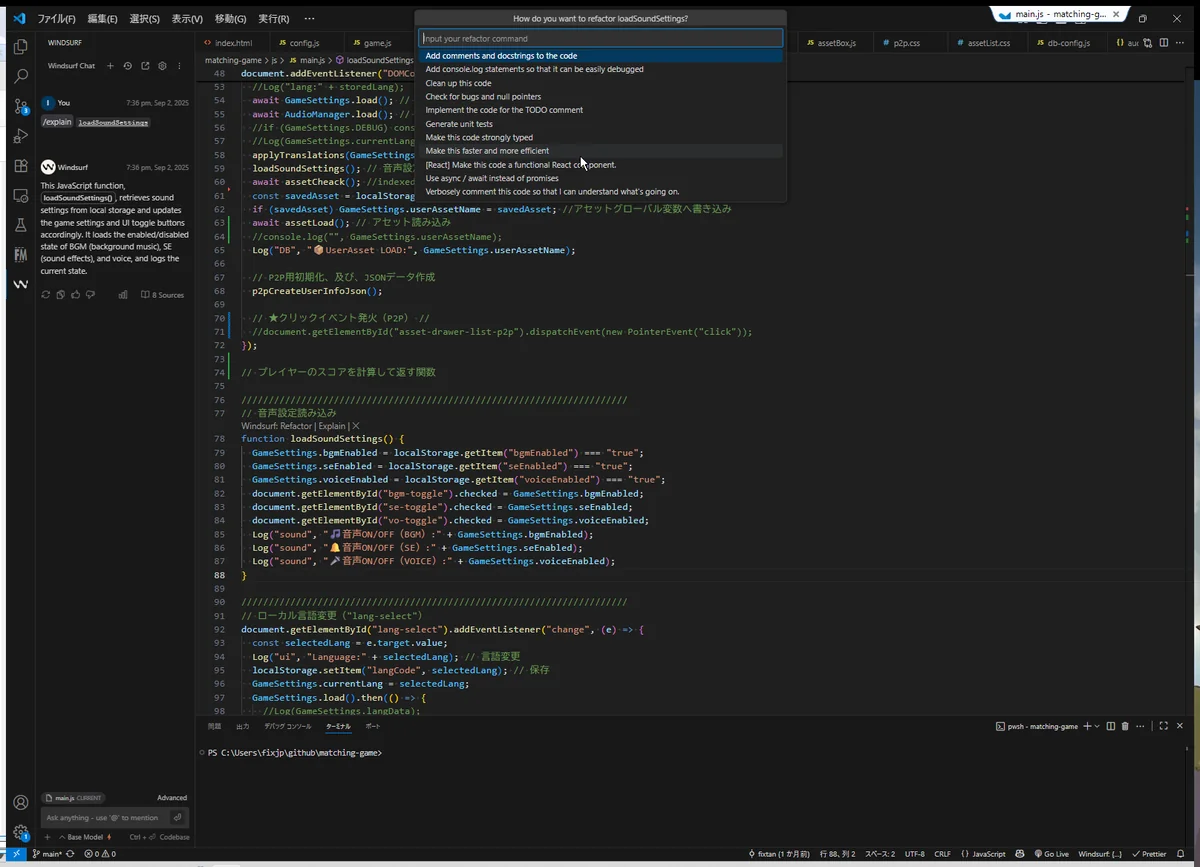 Ctrl + Iを押すと、関数ごとのリファクタリングメニューが出現。コメント付与・バグ修正・速度改善などの選択肢を一括で適用可能。